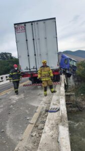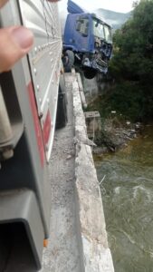 Carreta fica pendurada em ponte na BR 267