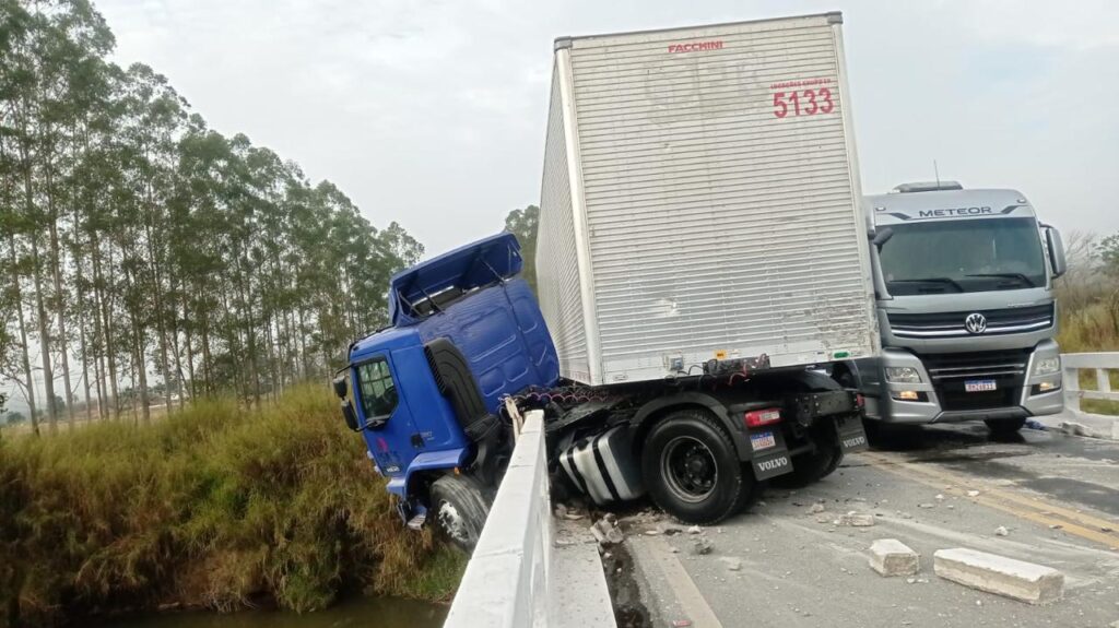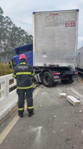 Uma carreta carregada com seis toneladas de produtos de um site de compras on-line ficou presa na proteção de uma ponte na BR 267, km 139, no distrito de Valadares, em Juiz de Fora. O Corpo de bombeiros foi chamado.