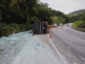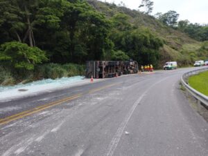 De acordo com a Polícia Rodoviária Federal, uma carreta carregada com lâminas de vidro seguia do Rio de Janeiro-RJ para Salvador-BA, quando, na descida da Serra da Bica D’água, o condutor, de 32 anos, perdeu o controle direcional sobre o veículo, que tombou, invadiu a contramão de direção e parou no acostamento, derramando a carga naquele local.