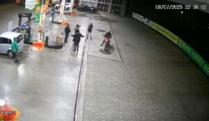 A câmera de segurança de um posto de combustíveis registrou o momento em que dois homens chegam armados em uma...