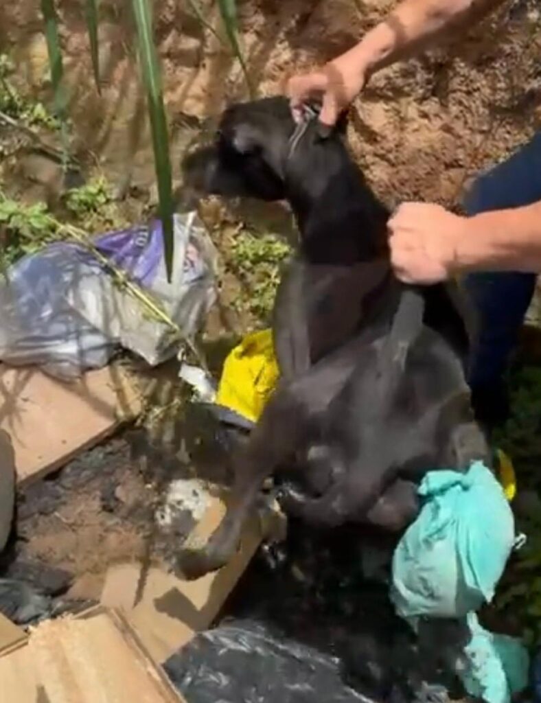 O cachorro foi socorrido e encaminhado a uma clínica veterinária. O laudo dos primeiros exames apontaram traumatismo craniano com sangramento nasal, desidratação severa, magreza extrema (caquexia), infestação de pulgas/carrapatos e ferimentos graves na região do ânus.