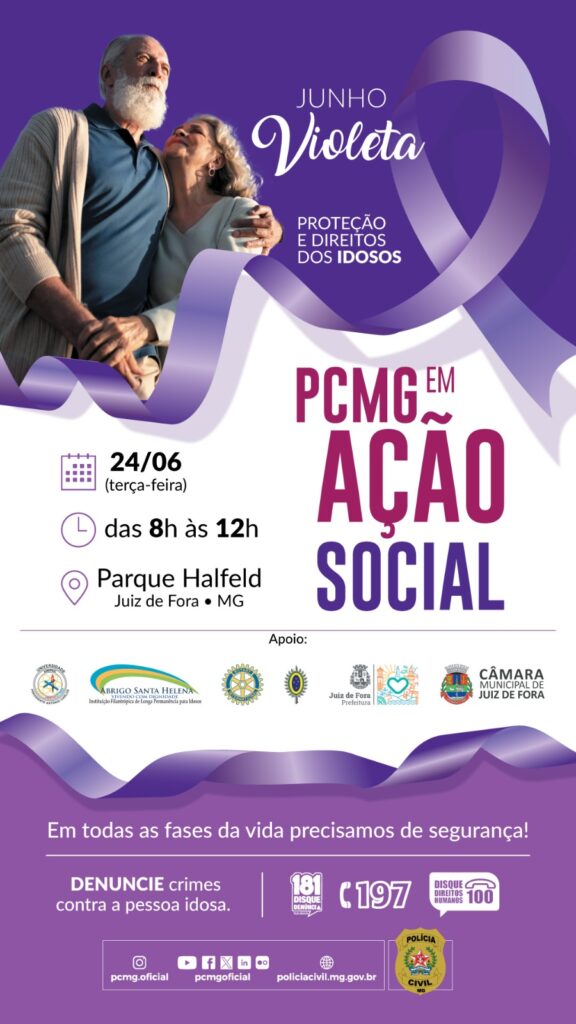 A iniciativa integra as ações da campanha da Polícia Civil de Minas Gerais no Junho Violeta, que reforça a mensagem “Em todas as fases da vida precisamos de segurança”, ressaltando a importância da proteção dos direitos da pessoa idosa.