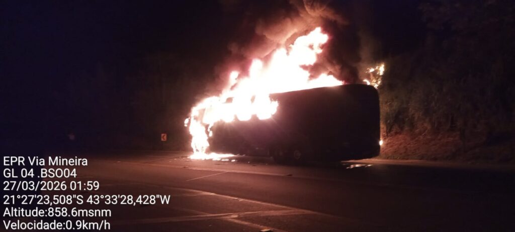 Na madrugada desta sexta-feira, 27/03, por volta das 02h00, o Corpo de Bombeiros de Juiz de Fora foi chamado para combater um incêndio num ônibus, ocorrido depois de um acidente de trânsito no km 746, em Santos Dumont, Zona da Mata mineira. A origem e o destino do coletivo ainda não foram divulgados.