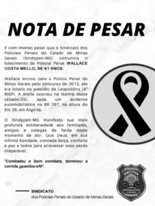 O Sindipen, Sindicato dos Policiais Penais de Minas Gerais, divulgou uma nota de pesar pela morte de um policial na manhã desse sábado, 25/10, na BR 267, em Argirita, Zona da Mata Mineira.